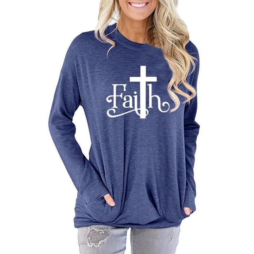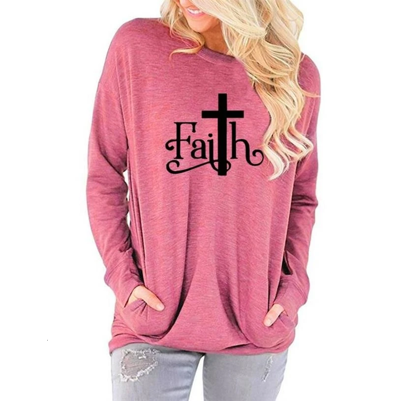Good Product For Women Faith Letters Print Long Sleeve Pocket Tops Sweatshirts Hoodies Women Cotton Harajuku Cut