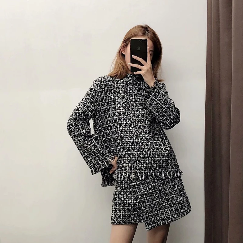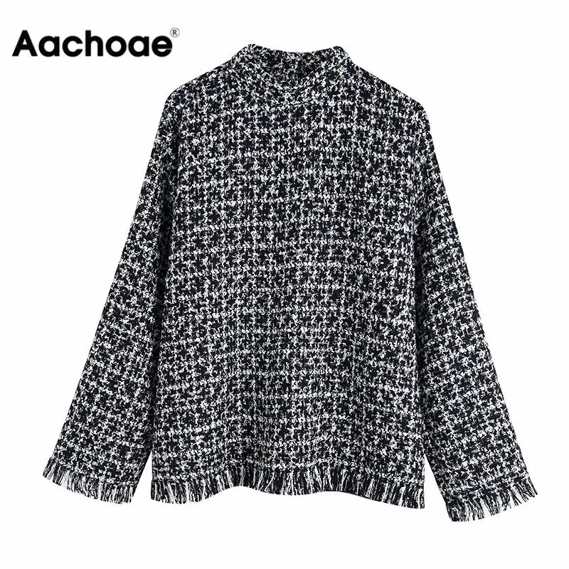 Promo Autumn Winter Houndstooth Women Hoodies Casual Stand Neck Top Fashion Chic Plaid Tassels Sweatshirt